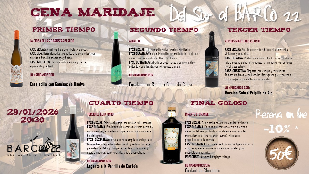Disfruta de una experiencia gastronómica única el próximo 29 de enero a las 20:30h. Un viaje de sabores que conecta la esencia del sur con nuestra bodega seleccionada en un menú exclusivo de 5 tiempos.