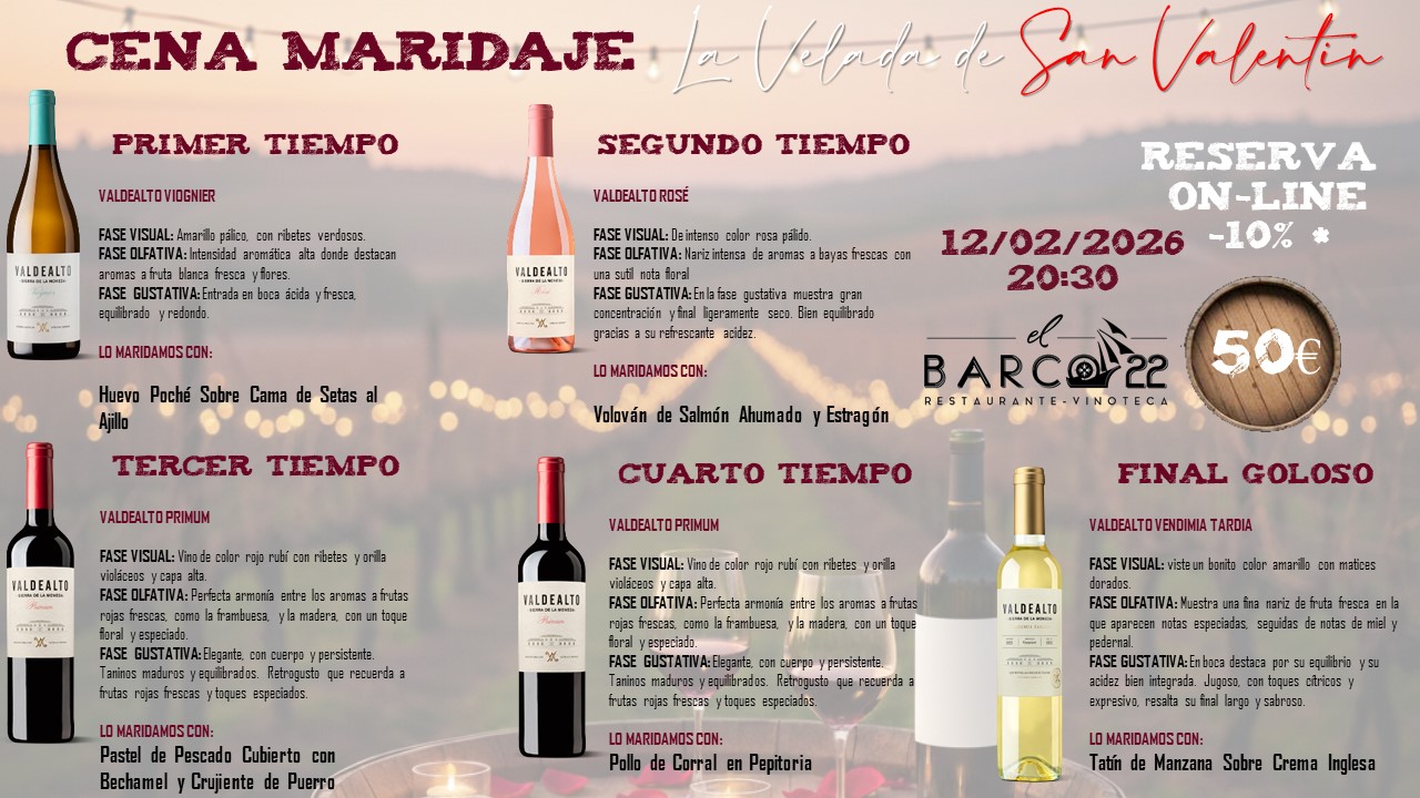 Disfruta de una noche mágica este 12 de febrero a las 20:30h en El Barco 22. Hemos diseñado un menú exclusivo de 5 tiempos, donde la alta gastronomía se encuentra con la elegancia de las bodegas Valdealto.